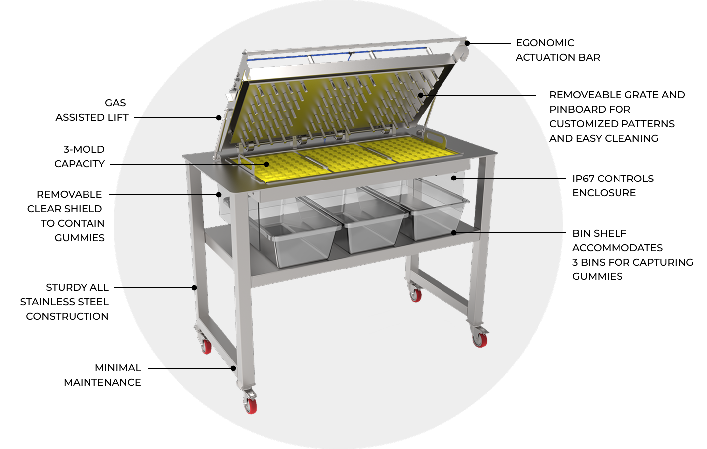 Demolds up to 46,500 gummies/hour with a rapid 3-second cycle time.